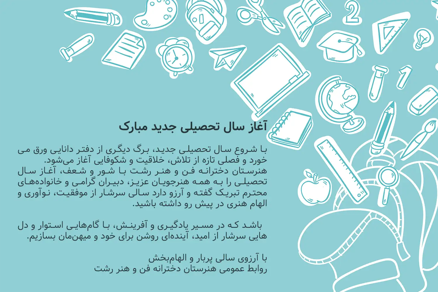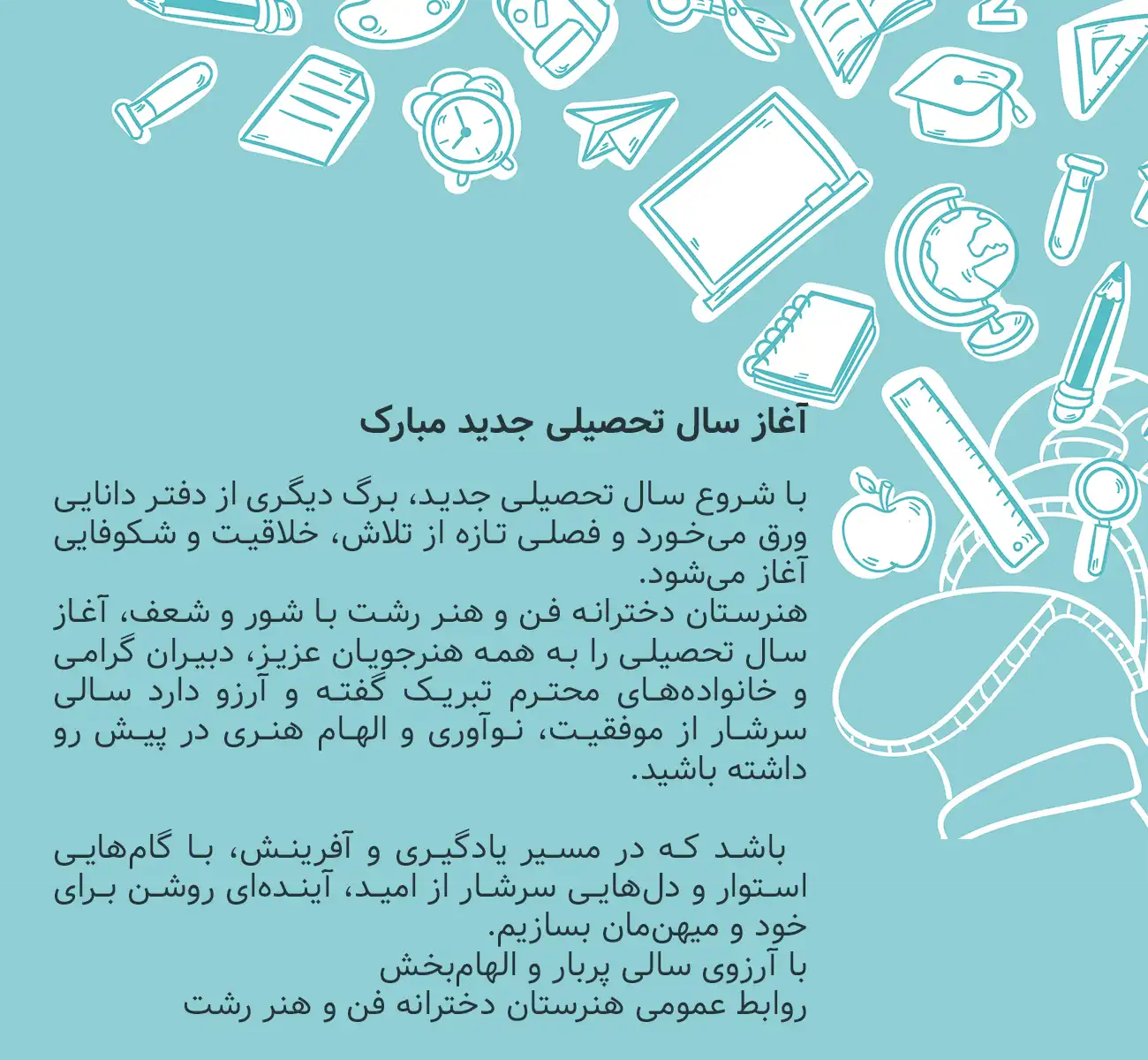 در هنرستان دخترانه فن و هنر رشت، تخصص یاد میگیرید نه فقط مدرک! با دبیران باتجربه، کلاسهای مجهز، محیطی ایمن و برنامههای علمی و فرهنگی، برای بازار کار و دانشگاه آماده شوید.